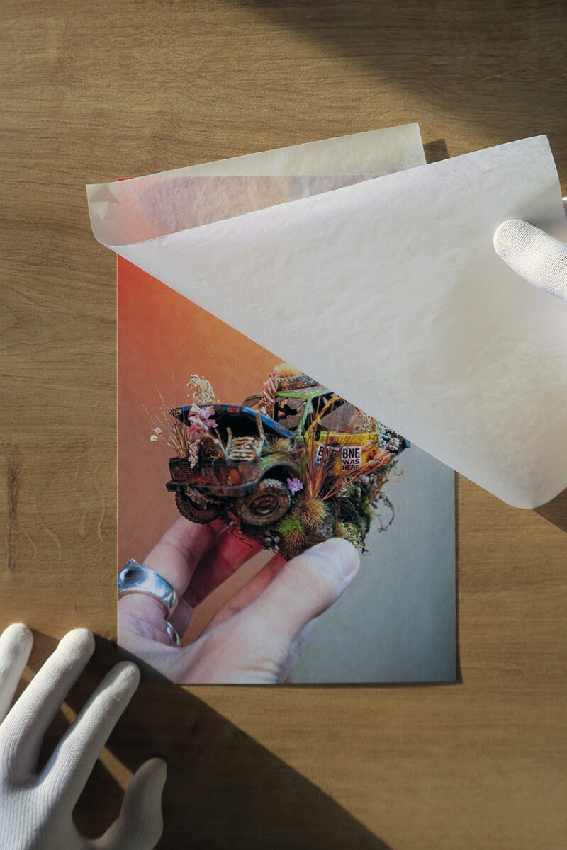 – Impression pleine feuille jet d’encre pigmentaire sur du papier “Bright White Hahnemühle 310g” réalisé sous contrôle de l’artiste